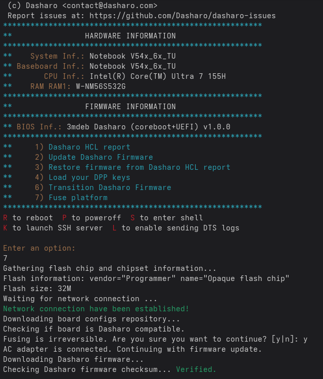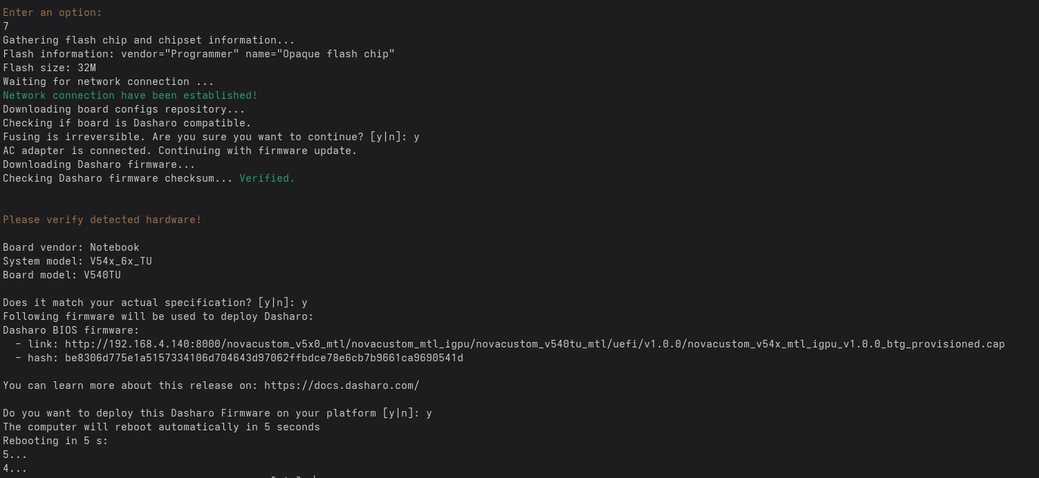 Procedure execution ends automatically on the reboot of the platform (unless it requires otherwise). After restarting the device, you can enjoy the basic version of Dasharo, which we provide for given hardware.