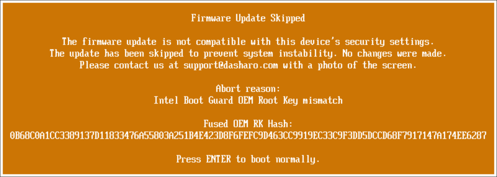 If you see this error, contact our support at support@dasharo.com, making sure to attach a photo of the screen you're seeing.